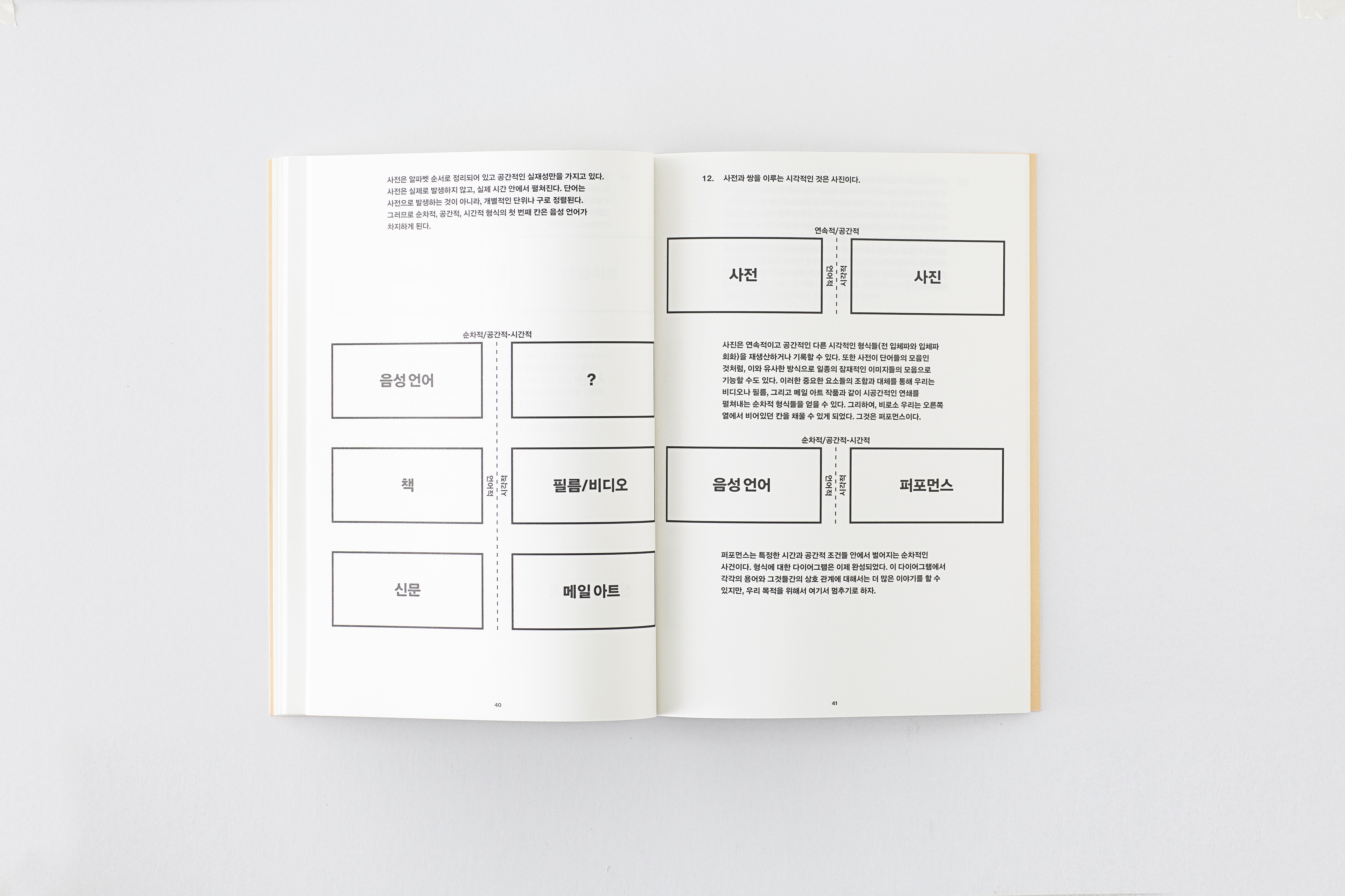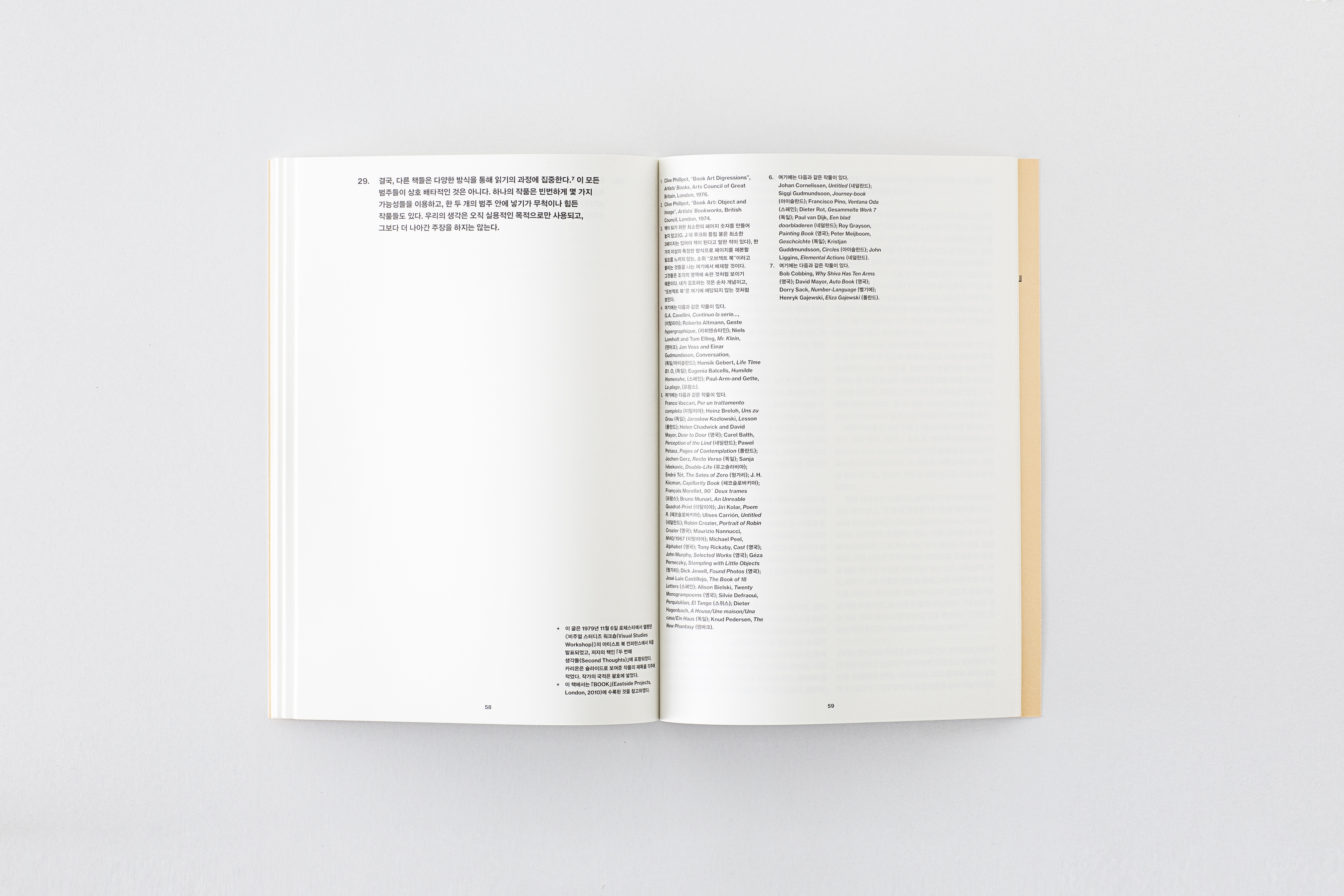 19. 이 모든 것이 일어난 것을 예술가들은 알아차리지 못했다. 왜 그들은 시에서 일어난 일에 주의를 기울어야 했는가? 몇 년 후 플럭서스와 개념 예술가들은 책을 표현의 수단으로 사용했다. 그러나 플럭서스에게 책은 지나치게 문화적 위신이 드리워진 사물이었다. 그래서 플럭서스 예술가들은 대부분 카드보드 상자 안에 느슨하게 묶인 카드와 같은 대안적 형태로 출판을 했다. 책과 책의 세계는 바꾸지 않고 말이다. 개념 예술가들은 책이 아니라 언어에 대해서 흥미를 느껴서 최대한 자신의 책을 평범한 것처럼 보이게 만들었다. 이처럼 플럭서스와 개념 예술가들로 인해 대중들에게 예술가의 출판물은 익숙한 것이 되었고 진지하게 받아들여졌다. 하지만 하나의 형식으로서의 책이라는 발전에 대한 기여는 구체시나 시각시보다 인상적이지 않았고 풍성하지 않았으며 다양하지 못했다. 이것이 “아티스트 북”라는 용어를 사용하는 것에 주저하게 되는 이유이다. 나는 차라리 “북웍스”이라는 용어를 선호하는데, 이것은 예술가들의 전유로부터 책을 자유롭게 하고 동시에 형식이나 자율적인 작품으로 강조하는 것이다. 같은 이유에서 나는 “아티스트 북”이라는 용어를 예술가에 의해서 만들어진 모든 책을 일컫는 데 사용한다. 도록이나 자서전까지 포함해서 말이다. (48페이지)