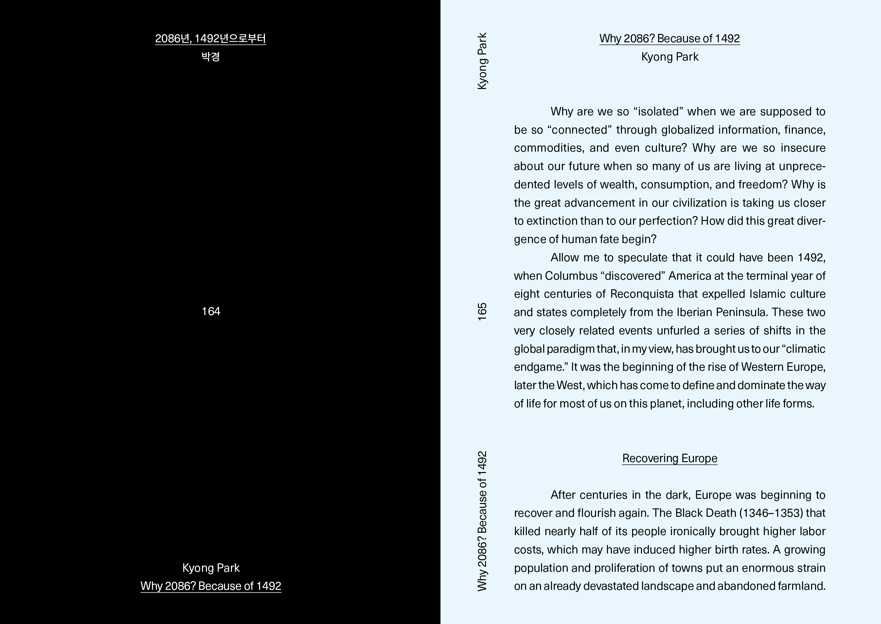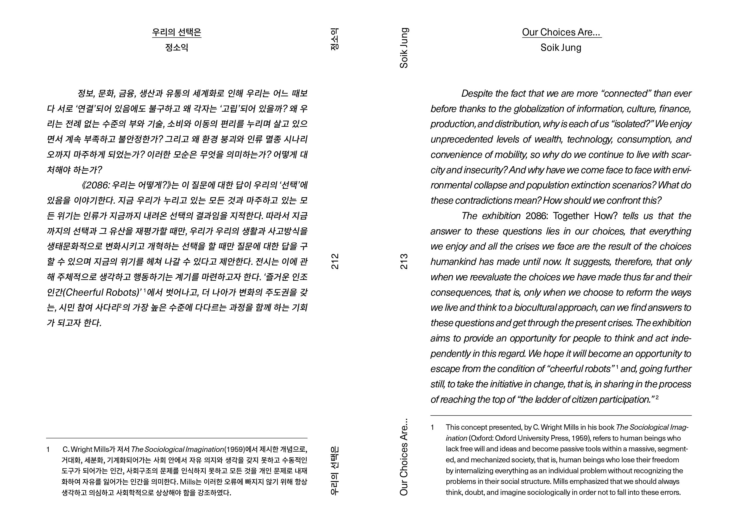 2023년 베니스 비엔날레 제18회 국제건축전 한국관 전시 《2086: 우리는 어떻게?》의 공식 출판물이다. 《2086: 우리는 어떻게?》는 세계 인구가 정점에 이른다고 알려진 2086년까지 현재와 미래의 사회 위기, 환경 위기를 어떻게 견뎌낼 수 있을지를 질문하고 미래를 상상해보는 프로젝트이다. 《2086: 우리는 어떻게?》는 지금 우리가 누리고 있는 모든 것과 마주하고 있는 모든 위기가 인류가 지금까지 내려온 선택의 결과임을 지적한다. 따라서 지금까지의 선택과 그 유산을 재평가할 때만, 우리가 우리의 생활과 사고방식을 생태문화적으로 변화시키고 개혁하는 선택을 할 때만 질문에 대한 답을 구할 수 있으며 지금의 위기를 헤쳐 나갈 수 있다고 제안한다.