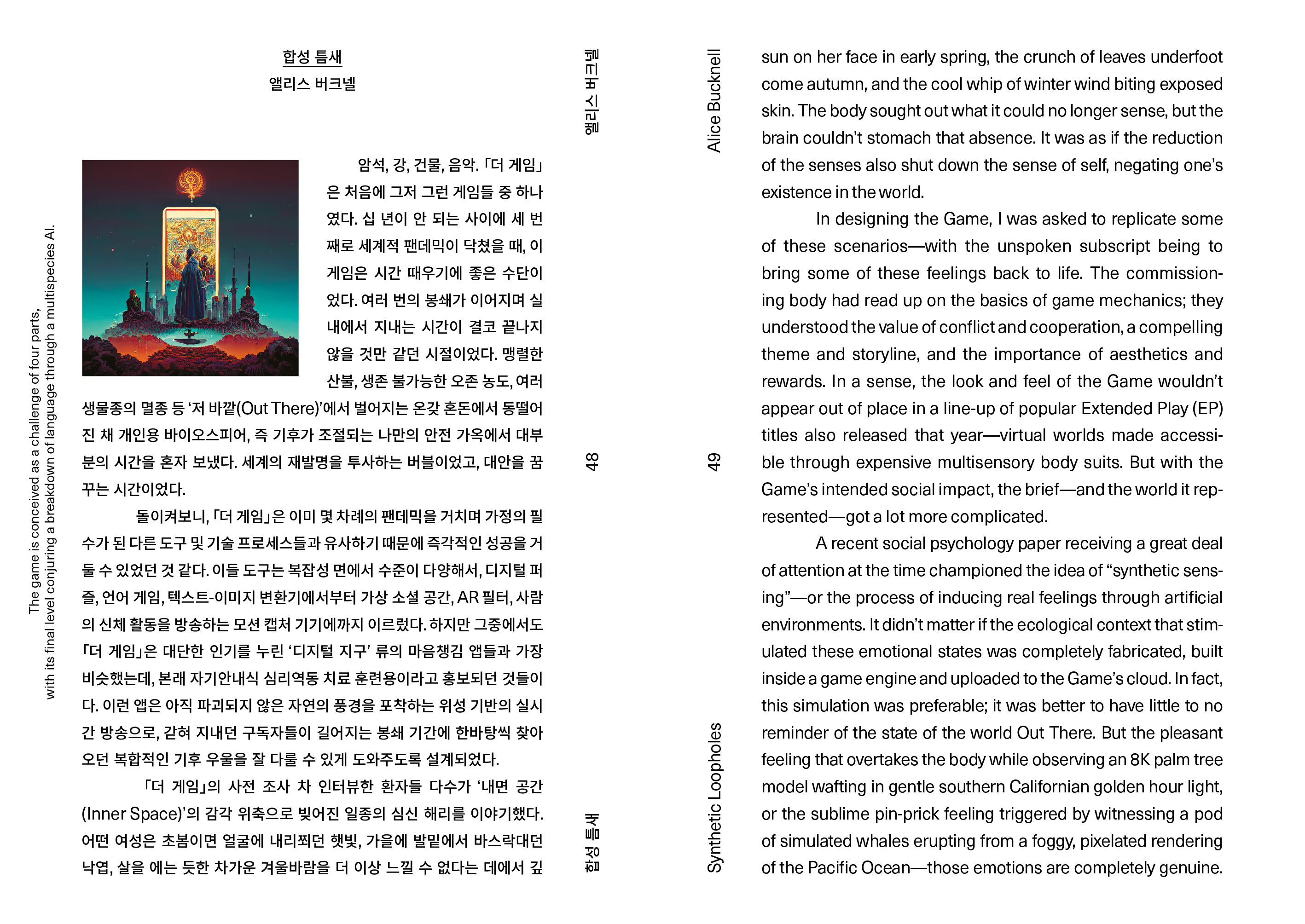 Alice Bucknell은 런던을 중심으로 활동하는 북미의 작가이다. 인류학과 건축학을 공부한 그녀는 주로 게임 엔진과 SF소설을 통해 건축, 생태학, 마술, 그리고 비인간과 기계 지능 간 상호연결을 탐구한다. 2021년에는 인공지능 언어 모델 GPT-3와 공동으로 작성한 텍스트를 중심으로 마술과 기술의 교차점을 탐색하는 협업 플랫폼 New Mystics를 설립했다. 그녀는 현재 런던예술대학교 센트럴세인트마틴의 내러티브 인바이런먼트(Narrative Environments) 석사과정에 출강하며 빅토리아 앤드 알버트 미술관, 이탈리아의 파브리카, 서던캘리포니아 인스티튜트 오브 아키텍처를 포함한 국제 기관, 박물관 및 대학에서 강연한다.