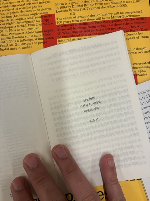 『금융화된 자본주의 시대의 예술의 성좌』는 서동진이 동시대 미술과 금융자본의 얽힘을 정밀하게 추적한 비평적 에세이다. 히토 슈타이얼의 ‘면세 미술’ 개념을 단초로, 오늘날 예술작품이 자율적 창작의 산물이 아닌 고수익 자산으로 기능하는 현실을 진단하며, 아도르노의 미학 이론과 마르크스주의 경제 분석을 교차시킨다. 예술이 시뮬라크르화된 가짜 구체성과 결탁하고, 미술관이 ‘체험의 전시장’으로 탈바꿈한 현장 속에서, 서동진은 작품과 예술가, 미술관이라는 제도가 어떻게 금융화된 추상의 체계에 포섭되었는지를 분석한다. 나아가 그는 오늘날의 미술이 신자유주의적 세계의 리얼리즘에 어떻게 응답하고 있는지를 묻는다. 본 텍스트는 2020년 부산현대미술관 전시 《동시대–미술–비즈니스》에 출품된 영상작업을 바탕으로 새롭게 쓰인 글이다.