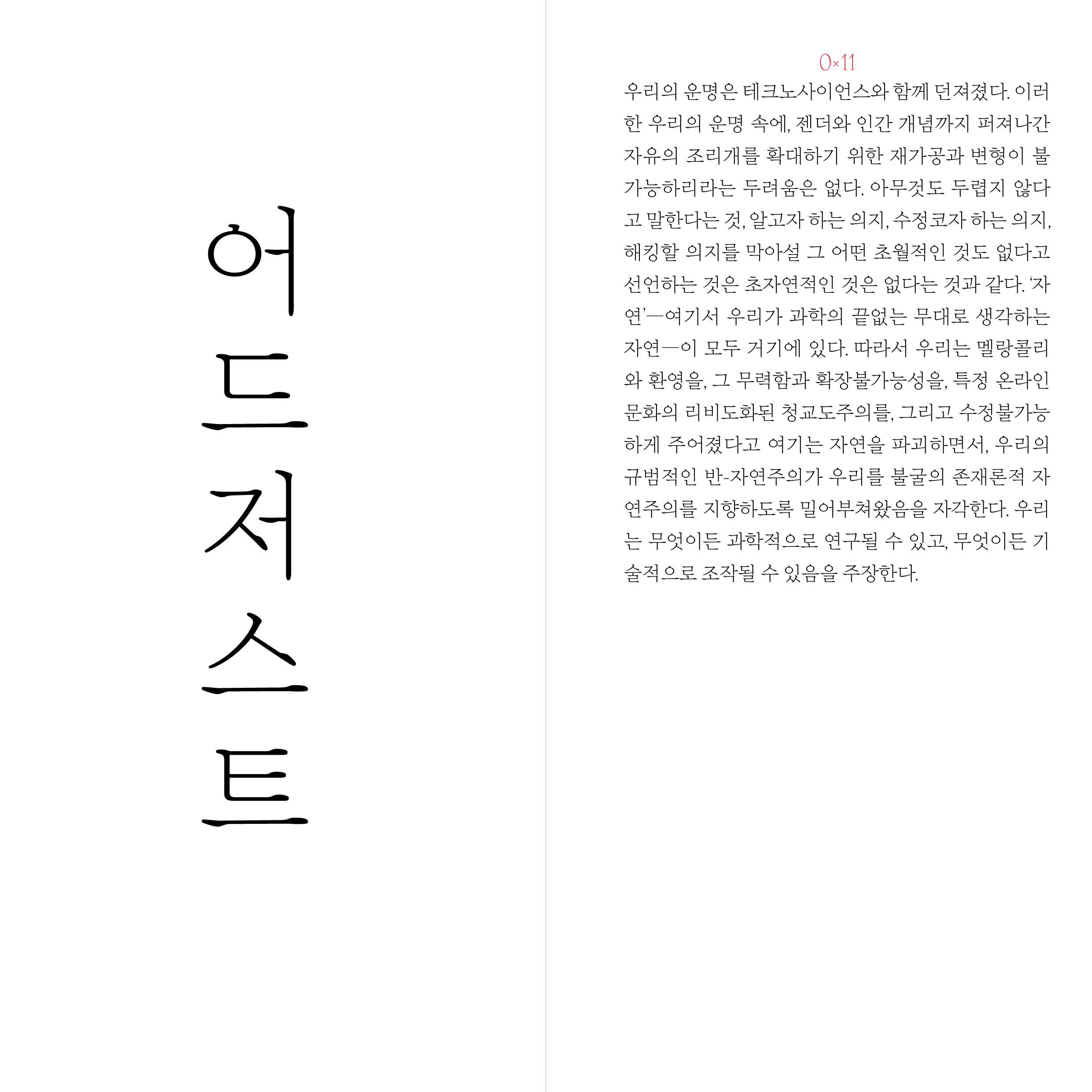“제노페미니즘은 유동적인 지도 위에 승전의 X로 이질적인 미래를 구축하고자 하는 욕망의 표식을 그린다. 이 X는 운명을 표시하지 않는다. 이는 새로운 로직의 형성을 위한 위상학적-키프레임을 삽입하는 것이다. 우리는 현재의 반복에 매여있지 않은 과거를 긍정하면서, 좁은 통로, 조립 라인, 공급용 배관보다 더 풍부한 기하학적 구조를 지닌 자유의 공간을 확충할 능력을 위해 싸울 것이다. 우리는 자연화된 정체성에 맹목적이지 않은 새로운 지각과 행동의 장비affordances가 필요하다. 페미니즘의 이름에서, ‘자연’은 더 이상 부당한 도피처가 되어서는 안 되며, 그 어떤 것도 정치적 정당화를 위한 근거가 되어서는 안 된다.