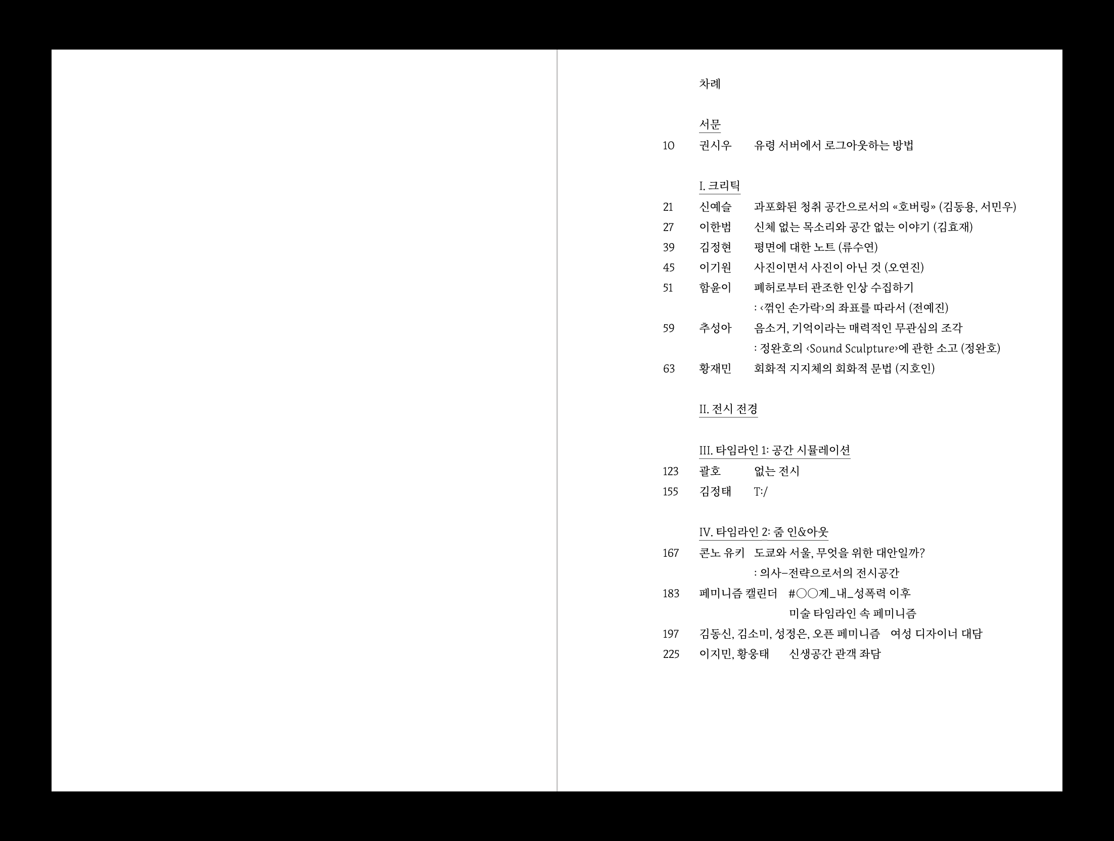 | 이 책은 지난 2018년 1월 6일부터 3월 18일까지 2/W에서 열린 전시 <호버링Hovering>의 도록이다. 목차 서문: 유령 서버에서 로그아웃하는 방법 - 권시우 I. 크리틱 1. 신예슬 - 과포화된 청취 공간으로서의 <<호버링>> 2. 이한범 - 신체 없는 목소리와 공간 없는 이야기 3. 김정현 - 평면에 대한 노트 4. 이기원 - 사진이면서 사진이 아닌 5. 함윤이 - 폐허로부터 관조한 인상 수집하기: 꺾인 손가락의 좌표를 따라서 6. 추성아 - 음소거, 기억이라는 매력적인 무관심의 조각: 정완호의 에 관한 소고 7. 황재민 - 회화적 지지체의 회화적 문법 II. 전시 전경 III. 타임라인 1: 공간 시뮬레이션 1. 괄호 - 없는 전시 2. 김정태 - T:/ IV. 타임라인 2: 줌 인 & 아웃 1. 콘노 유키 - 도쿄와 서울, 무엇을 위한 대안일까? : 의사-전략으로서의 전시 공간 2. 페미니즘 캘린더 - #OO계_내_성폭력 이후 미술 타임라인 속 페미니즘 3. 김동신, 김소미, 성정은, 오픈 페미니즘 - 여성 디자이너 대담 4. 이지민, 황웅태 - 신생공간 관객 좌담 V. 타임라인 3 : ‘신생’ 이후의 시간들 1. 장영주(엮는자) - 무공간성 2. 강정석, 권시우, 윤태웅, 황재민 - 강정석 작가와의 대담 VI. How to Use : 2020년대 타임라인 가설하기 1. 권시우 - ‘최소 환경’의 미술들 : 오픈베타와 ‘굿즈’ 사이에서 2. 김효재 - 2020년대 한국현대미술에 대한 망상과 예언 3. 윤태웅 - (비)고정적 시청환경을 위한 화면조정 4. 신희주X오연진 - 문화예술계를 위한 여성주의적 대안들 5. 황재민 - 2018년 국립현대미술관이 몰랐던 이야기들 필진 소개 |