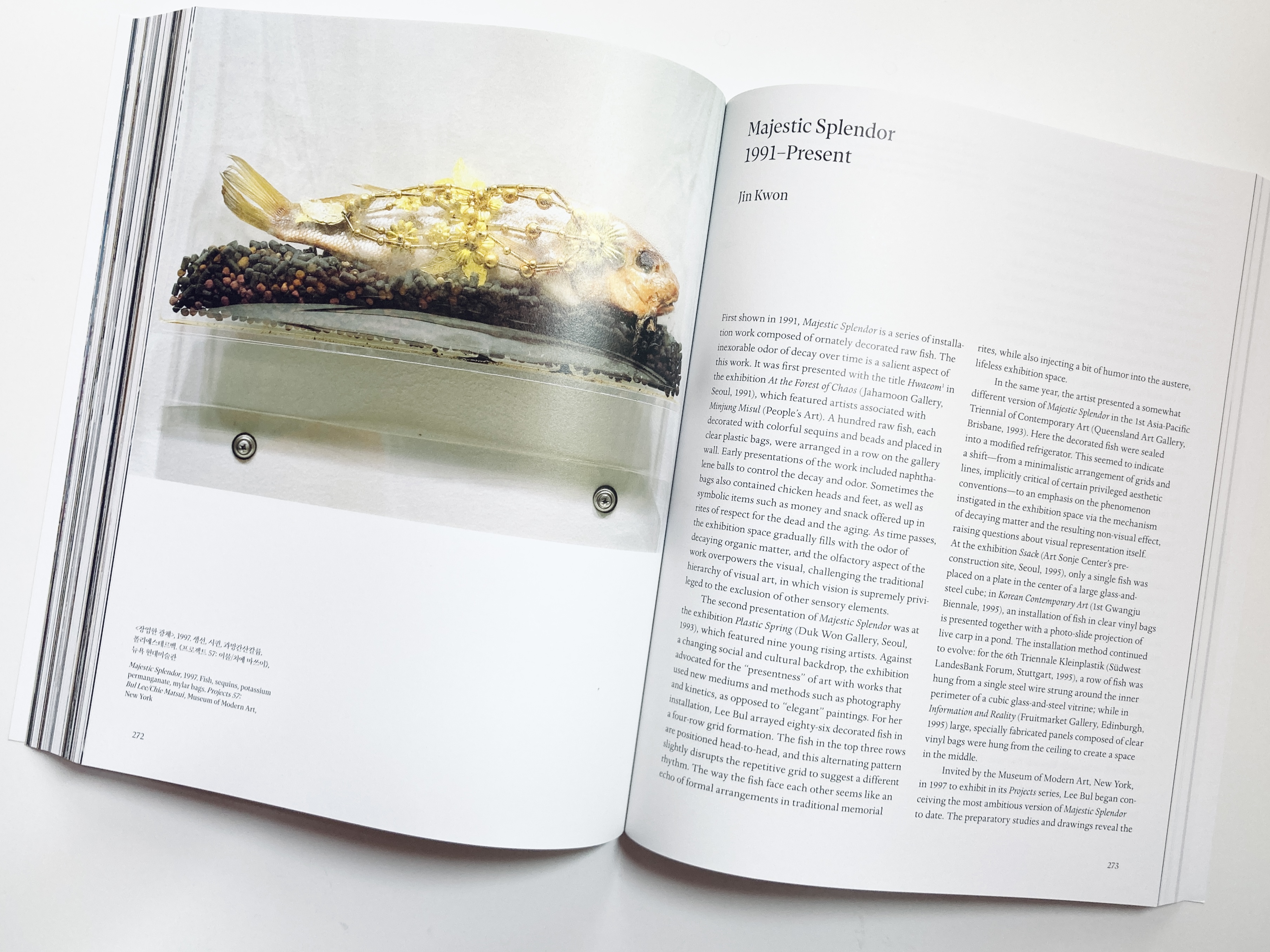 “이미지는 그간 “특권적” 위치를 점유해 왔기 때문에 이미지를 자율적이고 초월적인 세계로부터 바로 지금 여기, 이 세계로 끌어내리기 위해서는 재현의 외부에 존재하는 요소, 즉 시각이 아닌 다른 감각이 필요하다. 냄새가 난다는 것은 눈앞의 이미지가 현실 세계 저 너머의 미학적인 세계가 아니라, 우리와 함께 그저 같은 공간을 점유하고 있음을 암시한다. 이러한 현존의 언어는 하얀 벽에 걸린 비닐봉지에 들어 있는 것이 시간의 지속을 견디지 못하고 사라질 그저 연약한 ‘물질’의 현존임을 드러낸다.”
