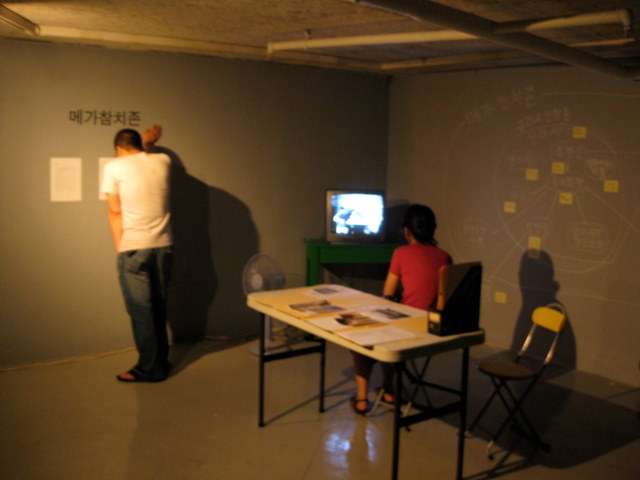 대학 동창으로 구성되어 있지만 그들이 현재 활동하는 면면 또한 전혀 다르다. 그러나 그들은 주기적으로 시간만 나면 카페에 모여 앉아 밤늦도록 정신 나간 이야기들을 일삼는데, 이 ‘목적 없는 상식을 외면하는 이야기들’을 만약에 어떤 세계관을 설정하는 컨셉 회의로서 가정을 하게 되면 많은 맥락들이 심상치 않은 은유와 현실 비판으로 보이는 경우도 간혹 있다. 류한길의 저열한 망상에서 비롯된 경기도 구리시 인창동 일대에 형성된 ‘메가참치존’의 이야기를 전해들은 나머지 구성원들이 기회가 있을 때마다 거기에 쓸데없는 살을 붙이는 것에서 모든 일이 시작되었다고 할 수도 있다. 따라서 각자 음악, 영상, 만화, 문학의 방향에서 활동하는 이들이 단순히 하나의 이야기를 구성하는 것이 아니라 오프된 상상력과 무작위로 뻗어나가 하나의 가상 세계관이 형성되어 나가는 과정 자체를 도큐먼트하고 아카이빙을 함으로서 결과적으로 그것들이 어떤 것으로 형성되는가를 판단해 보고 싶다. 이번 전시는 바로 이 프로젝트의 가장 첫 번째 실험이 될 것이다.